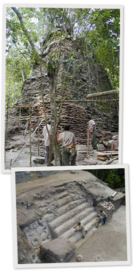 Rediscovered in 1926, this vast sophisticated metropolis of limestone temple pyramids predates all other major Mayan sites. Wonderful new technology and conservation strategies have been employed recently to preserve and maintain these ancient sites. Travelers are now fortunate to experience these treasures of Preclassic art and architecture. The monumental giants stand in predominantly triadic designs. The El Tigre Complex bears the principal pyramid El Tigre, one of the tallest pyramids found in the Maya World at 197 feet, with two smaller structures which face each other, all stairs leading from the central plaza. Huge stucco masks of deities flank stairways; some bear the likeness of a great bird deity.